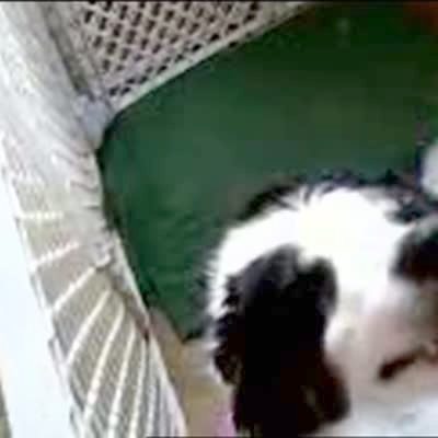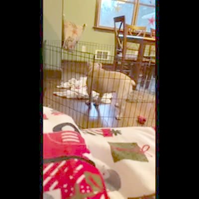 Puppy dog escapes from high metal fence / pen in house by climbing up and over.