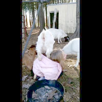 Baby goats jump/climb on a young girl repeatedly while she kneels in their pen. A dog howls off camera.
