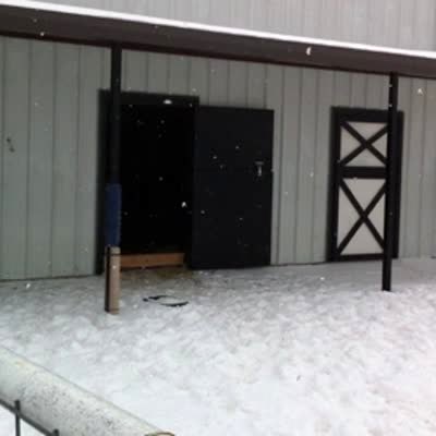 A dog stands up on his hind legs but falls over onto his pen fence and knocks it over. Security footage.