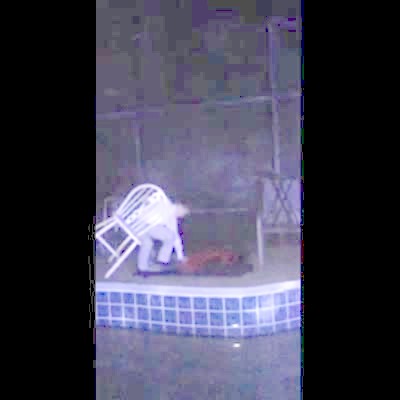 A young boy does a handstand on a chair next to a swimming pool and he falls off the chair onto the concrete cement then rolls over into the pool.