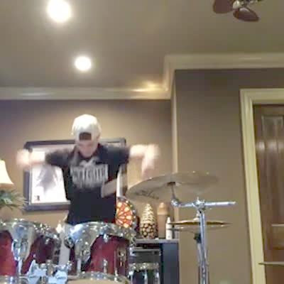 A ficus tree repeatedly falls on a man as he plays the drums for a church performance. He tries to push the tree up as he continues to play the drums.
