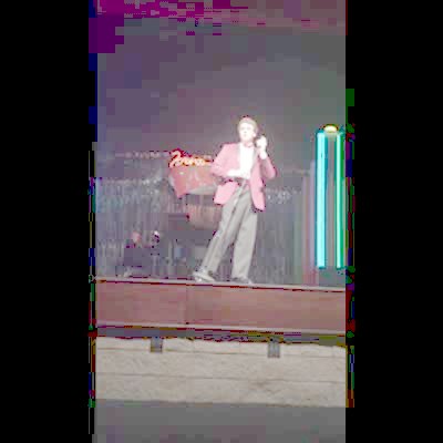 A young man sings in a show and his microphone flies out of the microphone stand and hits a wall. He continues to sing without the microphone and finishes his performance.