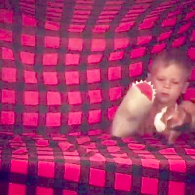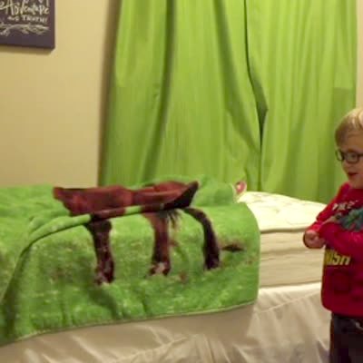 A tot boy performs a magic trick and makes his sister, a young girl, levitate in a bed. He then screams and runs away.