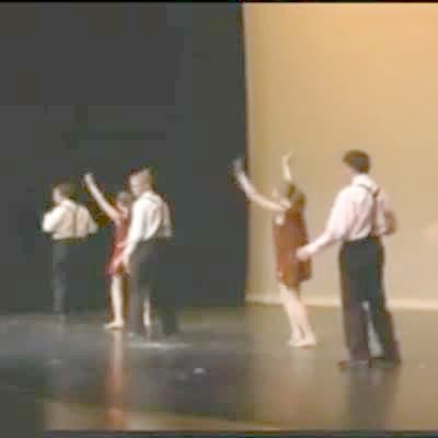Teen boy and girl perform a dance during high school event, boy lifts girl onto his shoulders, her dress goes over boy's face.