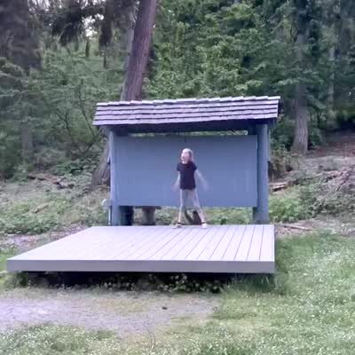 A woman tries to do a flip over her husband to show her friends, but he moves at the last minute and she falls on her face.