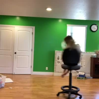 Two teen girls do a dance routine while on sits on an office chair and the other girl spins her. She falls off as the chair tips over.