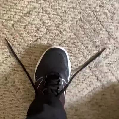 A man performs a magic trick by shaking his untied sneaker laces around on his foot and then shows that it ties a perfect bow in a house.