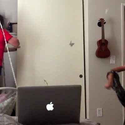 Two young girls dance with scarves in the bedroom as another girl spins in a chair, and the closet door breaks and falls onto a laptop.