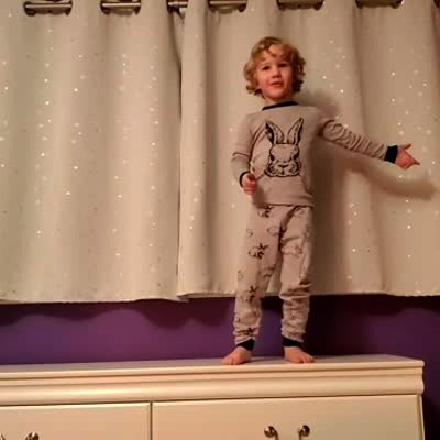 A tot boy sings and performs on his dresser drawers when he missteps and takes a tumble off of it in a bedroom.