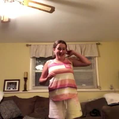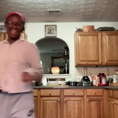 A woman dances in the house and lip sings. Then she falls in the kitchen. Music rights not cleared.