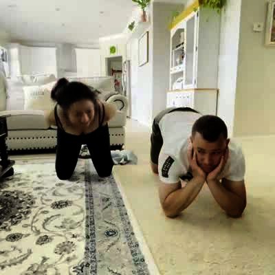 A man falls on his face in a living room as his wife has him perform a hand and arm pose on the floor.