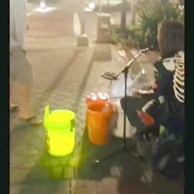 A drunk man dances while a man plays can drums and sings outside, then he trips and falls and knocks over one of the cans. Featured talent cleared only (the dancing man and the person who helps him up; drummer not cleared).