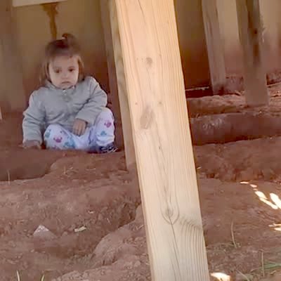 A tot girl sits in dirt under a house porch as a woman attempts to entice her to come out. The woman says, "I'm going in without you," to which the tot waves and says, "buh-bye."