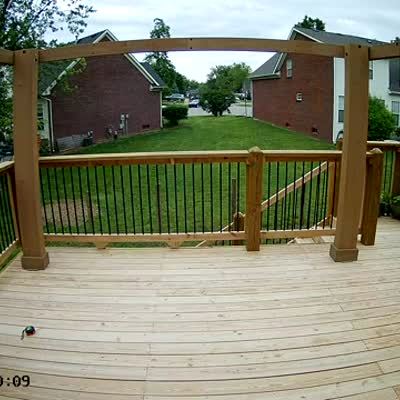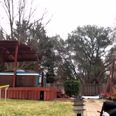 A man and a woman pull down a pergola using string. When it falls one piece smacks the woman in the head. Two young kids watch, they think it was cool. Their mother is not happy.