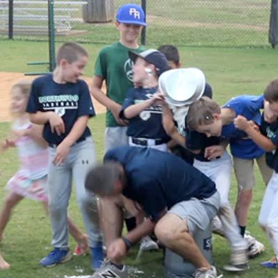 A man and a group of kids pose for a picture on a baseball field and someone off screen throws a pie at the man, but he ducks and the pie hits the boy behind him in the face.