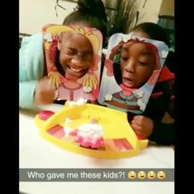 "Pie Face About-Face" - A boy loses the pie face game to his sister in the kitchen and gets upset because he doesn't know it's whipped cream on his face. He wipes it off, but then he tastes it and stops being upset. Snapchat text: "Who gave me these kids?!" Laugh emoji visible.