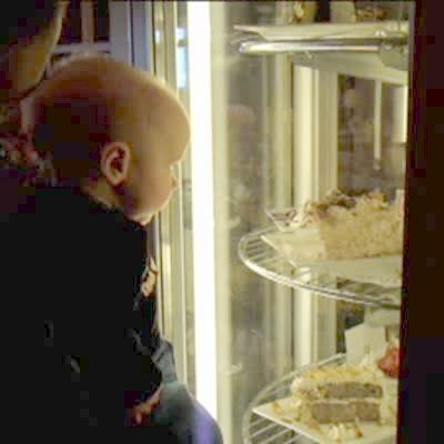 Baby boy stares at glass pie case as it turns in restaurant, when mom starts to pull him away, a large puddle of drool flows from baby's mouth. Hungry.