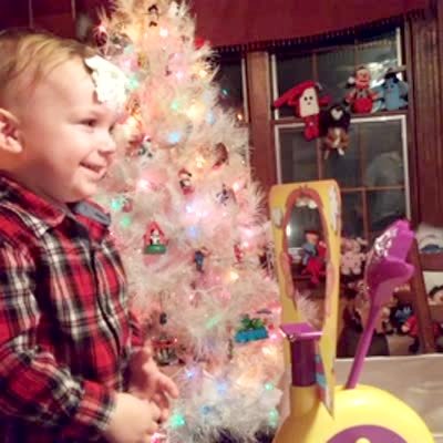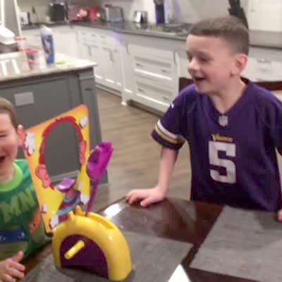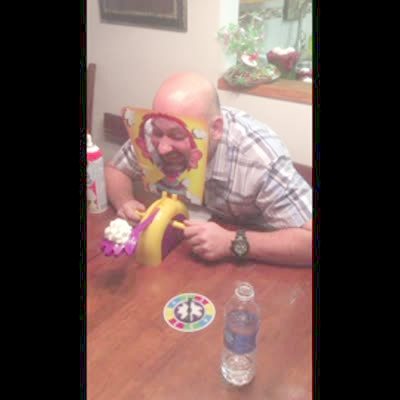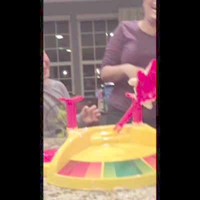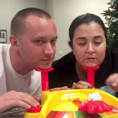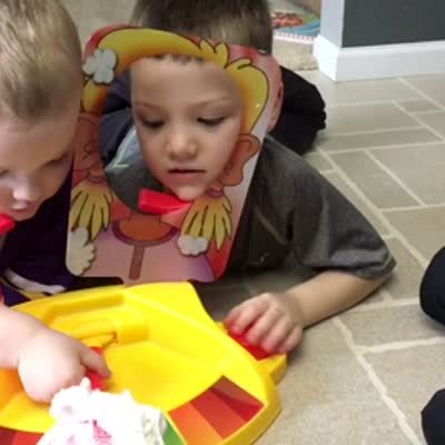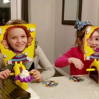 A woman and a young girl play the Pie Face! game at the dining room table. The woman takes her turn, spins the mechanism and avoids the pie slap. The young girl takes her turn, spins the mechanism and the pie is propelled into her face. She immediately starts to cry. Suddenly her younger brother. off-camera, starts to cry as a reaction. Both cry uncontrollably as the woman laughs.