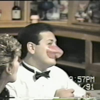 Boy in a tuxedo at a wedding, licks a piece of meat then slaps man in face and the meat sticks to man's face.
