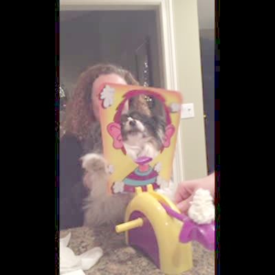 A woman plays "Pie Face" and holds a dog in her lap and puts the dog in front of a lever of whipped cream. She launches the whipped cream but it misses the dog and hits her in the forehead.