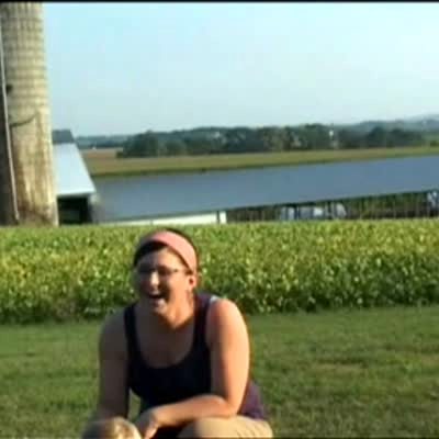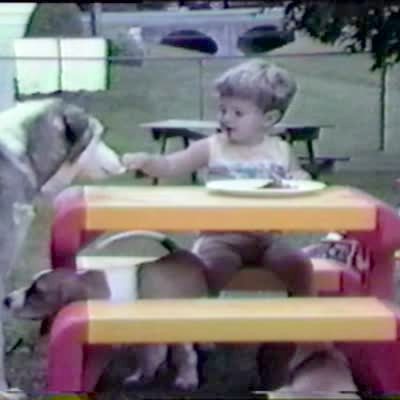 Tot boy falls backwards on plastic patio chair while eating ice cream sandwich. Woman stuffs her face with ice cream.