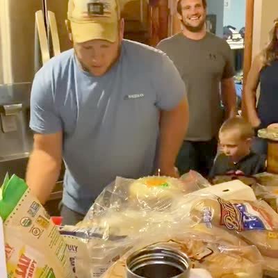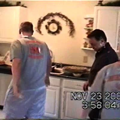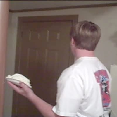 Man hits teen boy in the face with a pie when boy walks into kitchen