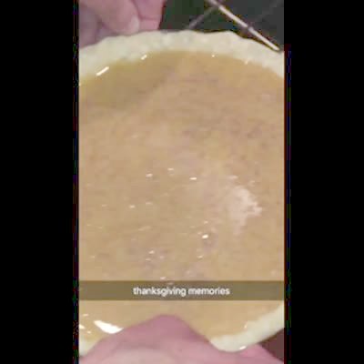A man lowers a pie into an oven in the kitchen while a woman tells him not to spill any of the contents. He places it on the rack too hard and spills the contents of the pie as well as the pie already on the rack. Snapchat