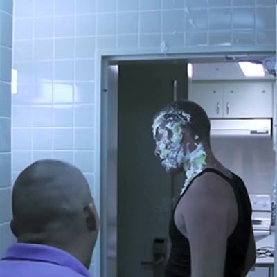 A man hides in the shower and slams a pie in his face. The video plays again in slow motion.