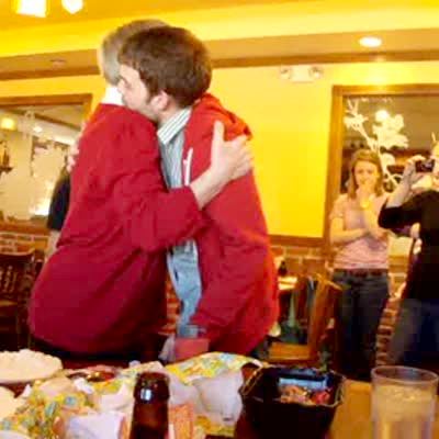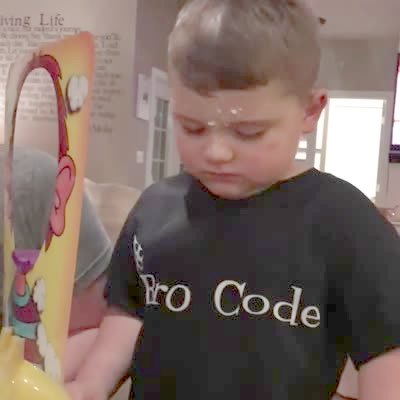 "Two Pie Birthday Guy" Young teen boy is hit with a pie in the face at 6am for his birthday. Practical joke. Surprise.