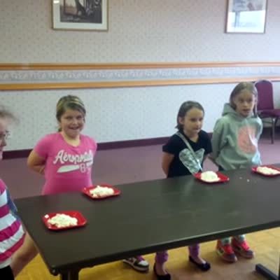 Five young girls stand around a table waiting to compete in a pie eating contest. When it starts, the girl in the pink shirt slams her head into the table and falls to the floor.