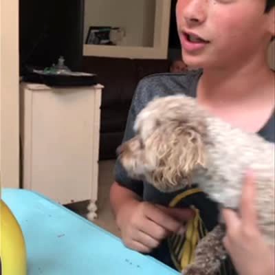 A man holds a miniature Pinscher dog while a woman turns the crank of the game "Pie Face" in a dining room, then the dog gets a small amount of whipped cream, and the rest of it lands on the man's forehead.