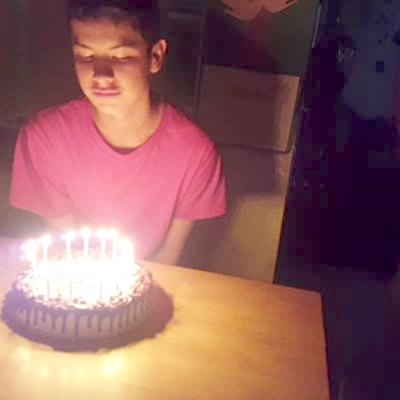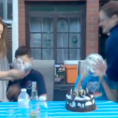 Teen boy goes to blow out the candles on his birthday cake and man slams pie in boy's face.