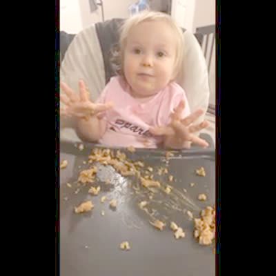 A girl plays pie face in the kitchen and the whipped cream gets launched at her face, but it overshoots and goes over her head and hits a tot boy behind her in the face.