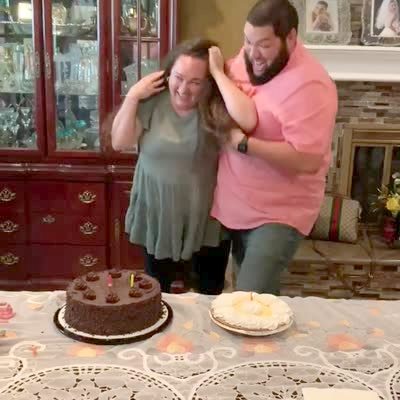 Senior woman smashes a pie in her adult grandson's face at a birthday party, crosses the item off her "bucket list." Practical joke.