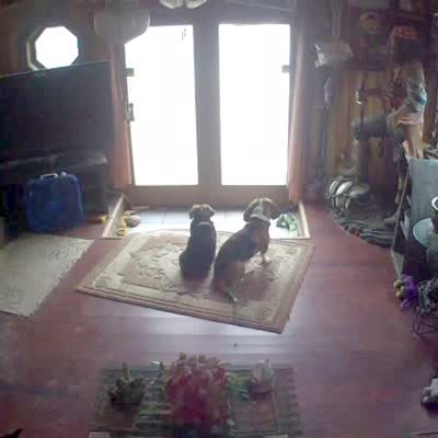 Two Beagle dogs sit in the living room. One dog barks, scaring the other, who runs into a planter and knocks it over, breaking it.
