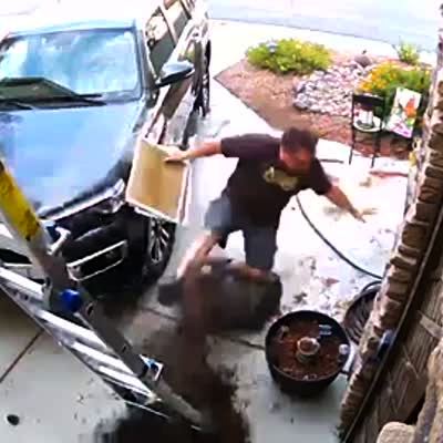 A man climbs down a ladder in a front yard but steps onto a potted plant that has a fairy garden and falls backwards and breaks open the pot.