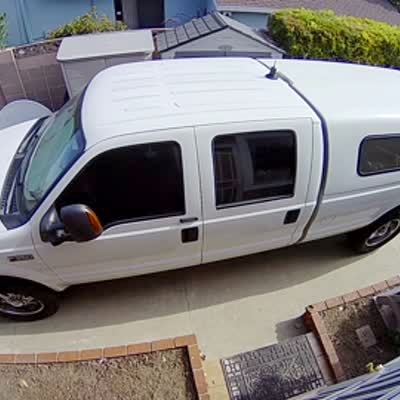 A man runs out to a car in the rain, then slips and breaks a pot in the front yard. Security footage.