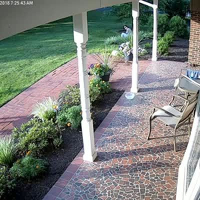 A man moves a planter then thunder strikes and he runs into the house as he flails his arms. Security footage.