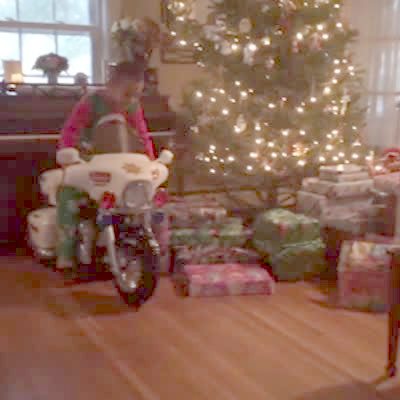 A young boy accidentally breaks his tot sister's dollhouse when he drives in to it with the toy power wheels motorcycle he got for Christmas.
