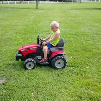 A tot boy drives a Power Wheels Gator Truck. His brother rides up on a tricycle and grabs onto the back of the truck. He drags behind the truck for a bit before he lets go. Toy car.