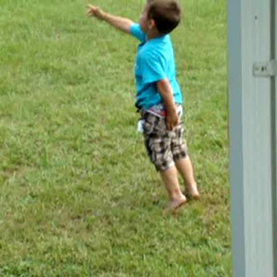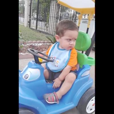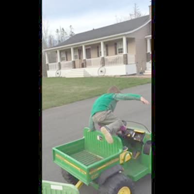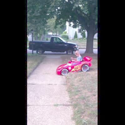 A young boy pops a wheelie on Power Wheels battery-powered car then drives out onto a road. His dad chases after him and the boy lets out an evil cackle at the end of video.