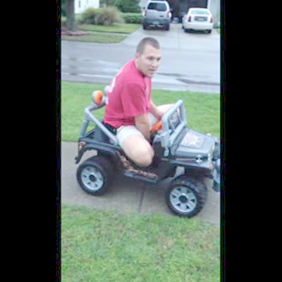 A man rides a child's power wheel Jeep down a hill, then it breaks in half.