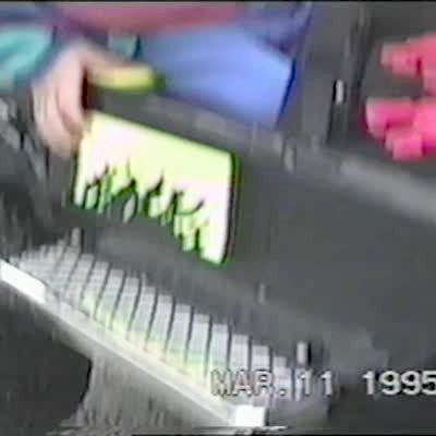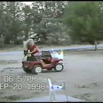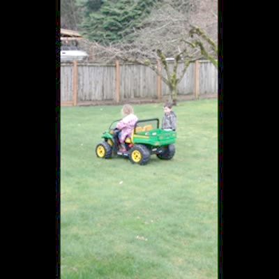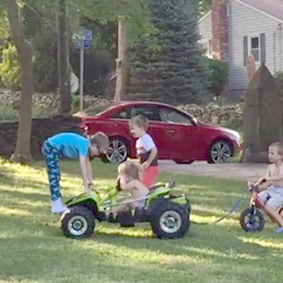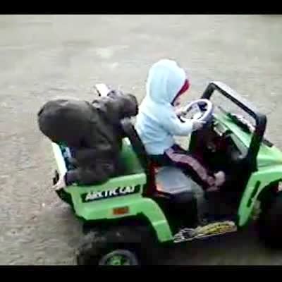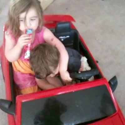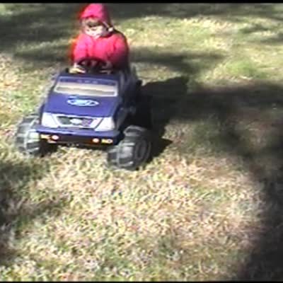 A boy instructs his tot sister on how to drive a power wheels car while he rides behind her in a trailer wagon, then hops into the car to push the gas for her when she can't figure it out. He steps back into the wagon when she hits the gas and he falls out and gets run over.