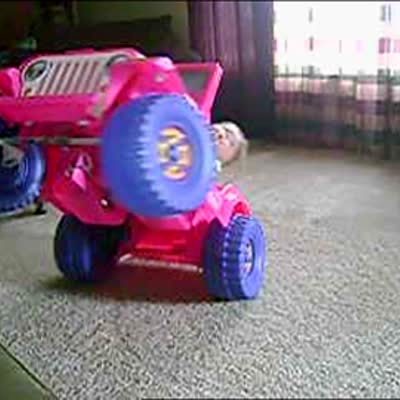 A young girl drives a Power Wheels Jeep up a ramp and crashes face first into a puddle of mud.