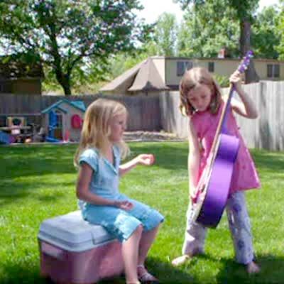 2 girls sing "We Will Rock You" in the backyard. Tot boy hits girls with Power Wheels truck. 1 uses a cooler as a drum & the other plays guitar.