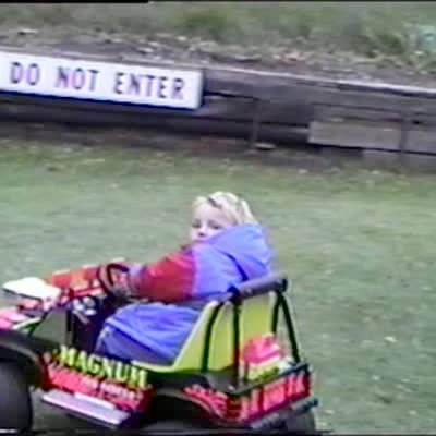 "Road Rage Rascal" A tot boy and his a tot girl drive in a power wheels car outdoors and it gets stuck on a curb. The boy gets out of the car and kicks the car repeatedly from behind but is unable to get the car out of the curb, even with the help of a woman and another boy.