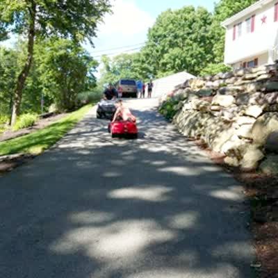 A man and woman ride power wheels cars down a hill in the driveway and the woman screams while she loses control of the car and skids to a stop. The man spins around and the car flips over and he falls out.
