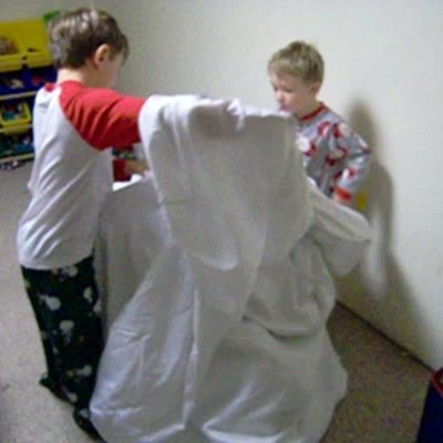 Two boys pull a sheet off of a power wheels motorcycle with one of the boy's names on the front of it at home. The other boy climbs on it and runs the younger boy over with it.