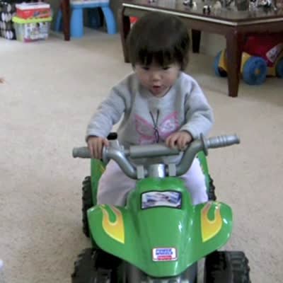 A tot girl rides a Power Wheels ATV and hits her head on a table indoors.