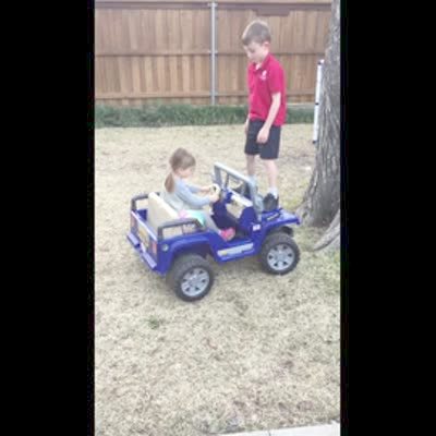 A young boy climbs into the back of a power wheels car and falls to the ground when his sister drives forward